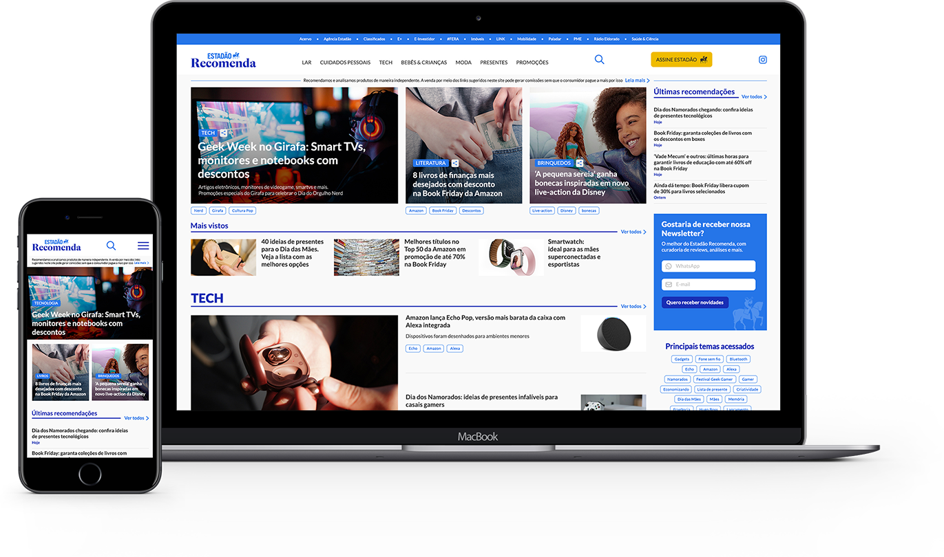 Tivemos o prazer de sermos procurados para reformular a sessão "RECOMENDA" do site do Estadão. Uma parte bem complexa onde teríamos que melhorar a acessibilidade e uma total reformulação das páginas internas, filtragem e subcategorias de menus, e uma melhor usabilidade de toda jornada do usuário nessa sessão. Ao mesmo tempo, prezamos a identidade do Estadão na página e em todos os elementos, trazendo a sessão "RECOMENDA" mais pra identidade-mãe do Estadão, com um design moderno, agradável pra leitura e pro UX. Acesse https://www.estadao.com.br/recomenda/